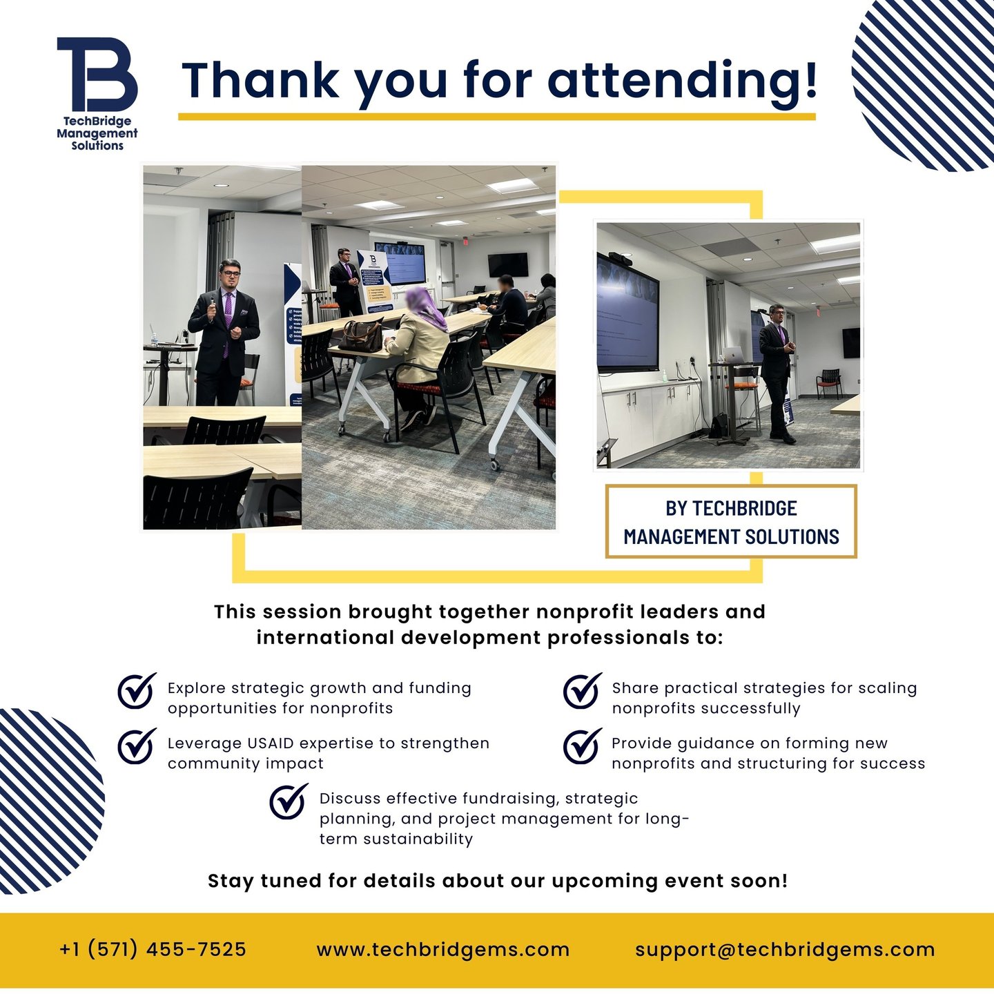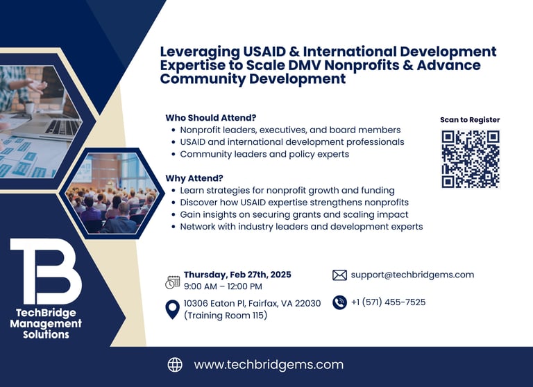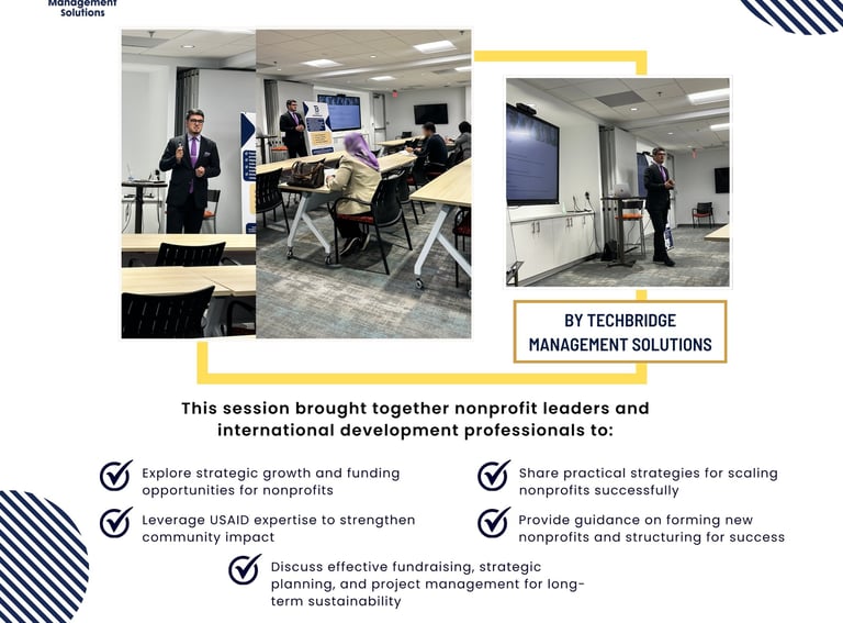 On February 27, 2025, TechBridge Management Solutions hosted a highly impactful workshop aimed at empowering local nonprofit leaders and international development professionals in the DMV region. This event focused on practical strategies to enhance nonprofit growth, sustainability, and community impact by leveraging the expertise of professionals affected by recent international development workforce shifts.