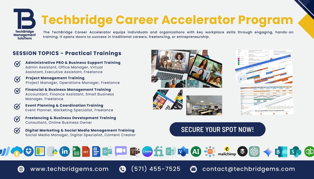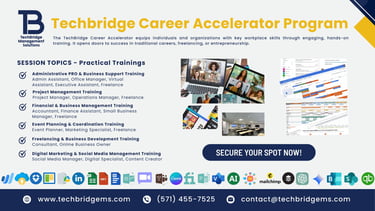 The TechBridge Career Accelerator is a structured professional development initiative designed to equip individuals and organizations with essential workplace skills. This program serves as an umbrella for multiple practical training tracks, preparing participants for traditional employment, freelancing, or entrepreneurial ventures.